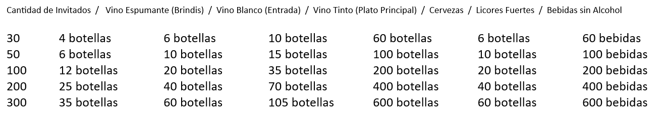 Este cuadro práctico te ayudará a calcular rápidamente la cantidad de bebidas que necesitas según el número de invitados: